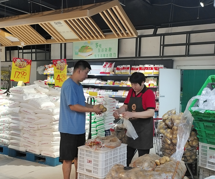 店慶期間,高新店同事們?yōu)榉奖泐櫩桶葱栀?gòu)買、減少排隊(duì)時(shí)間,利用中午休息時(shí)間提前將土豆分級(jí)裝袋。