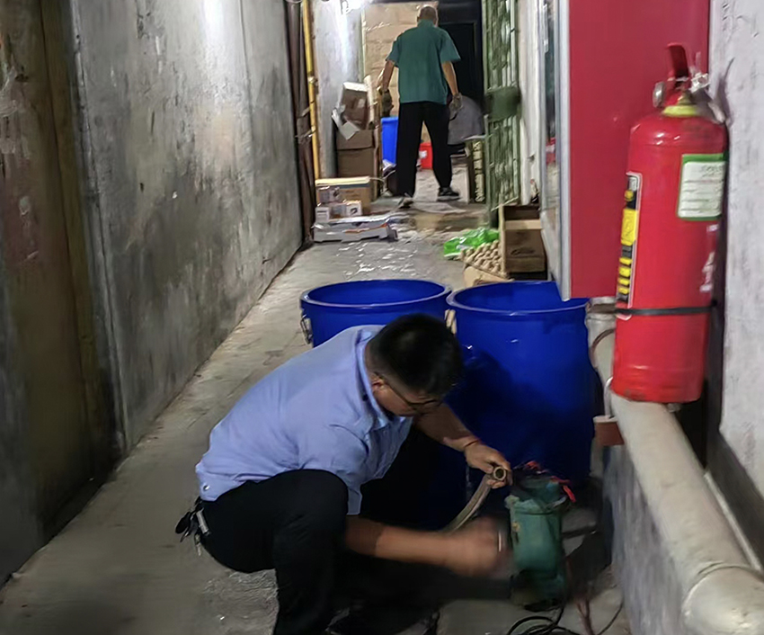 暴雨期間,安保部加強(qiáng)防汛檢查,發(fā)現(xiàn)積水后,及時(shí)攜帶抽水設(shè)備協(xié)助保潔員迅速清理,排除安全隱患。